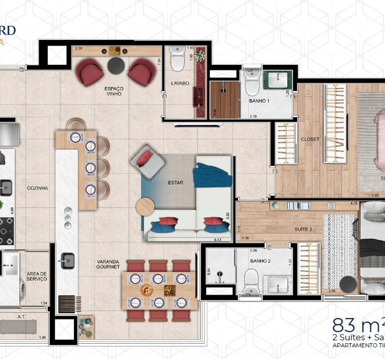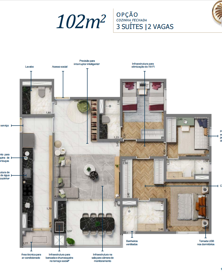 Oferece Lazer no Rooftop, com Mirante - Sala Fitness - Piscina externa - Quadra de esportes - Churrasqueira a carvão na Varanda - Infraestrutura completa para ar-condicionado com área técnica - Amplo pet place